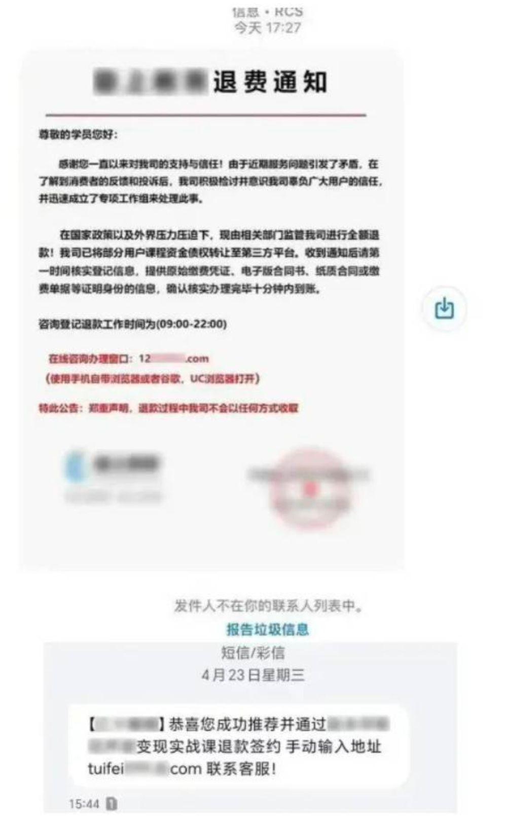 骗子通过向用户发送虚假退费通知短信,谎称提供退费服务,引导用户点击进入虚假网站,从而实施诈骗。