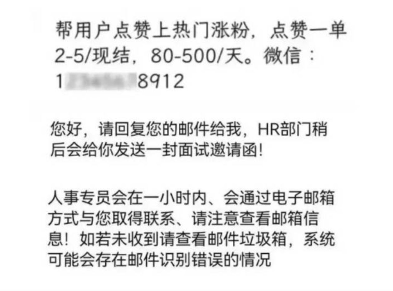 骗子通过向手机用户发送高薪兼职或招聘岗位短信,诱导用户发送个人信息并引导至涉诈APP进行刷单,进一步实施诈骗。