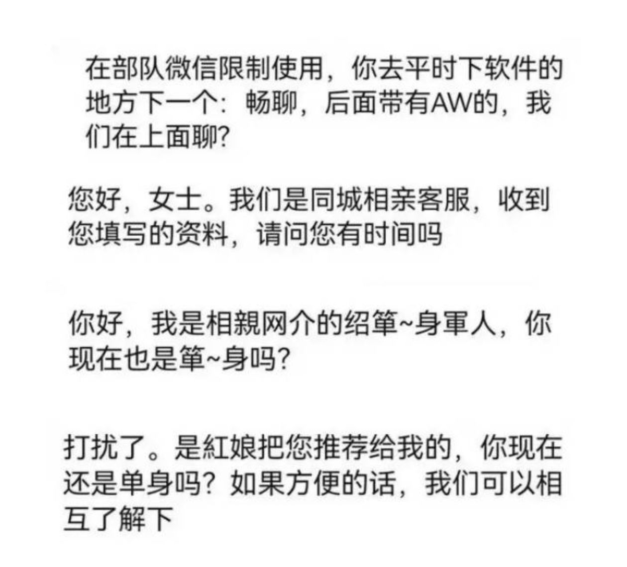 骗子发送自称通过他人介绍、某APP好友等带有相亲意向的短信,或冒充提供相亲服务,诱导用户添加其联系方式、回拨电话、下载APP等进行引流,实施诈骗。