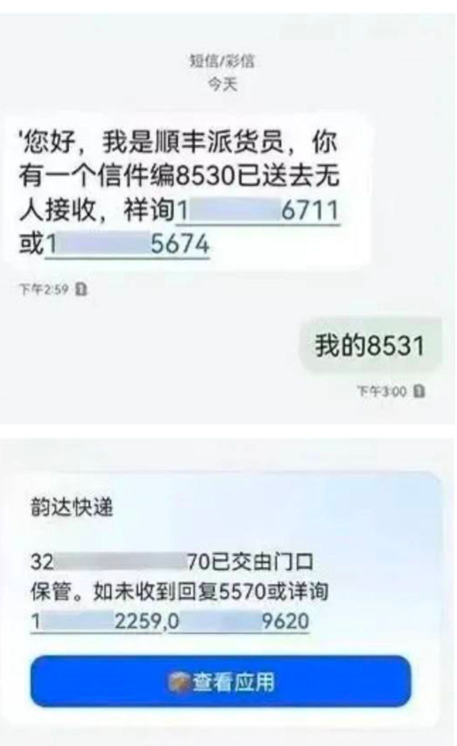 骗子冒充快递物流公司,向手机用户发送快递取件短信,并在短信内预留手机号码,当用户到驿站取件未果时,将会拨打预留电话,进而会被引诱上当受骗。
