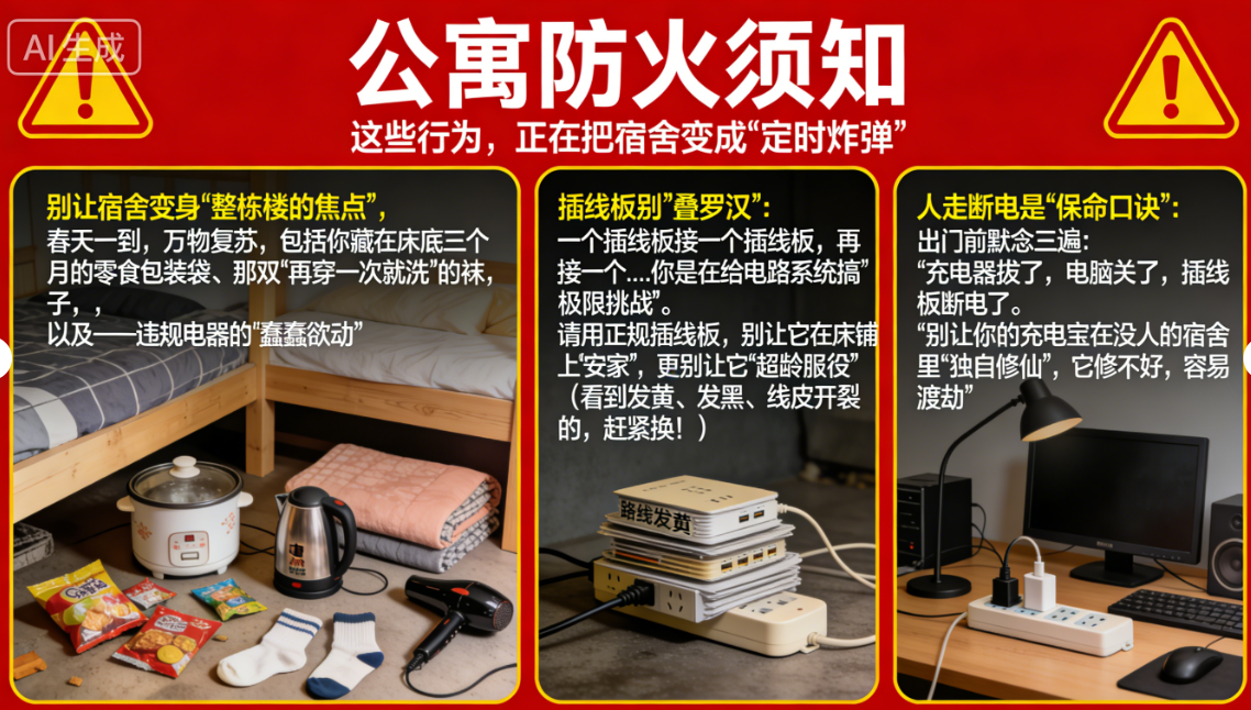 电动车:别让它“火”起来:校园里的“小电驴”是你的代步神器,但请千万别把电池带上楼充电!也别从楼上“飞线”充电。锂电池起火的特点是:瞬间爆燃、扑救困难、毒烟巨大。别心存侥幸,你的“方便”可能让整栋楼的人“逃命”。