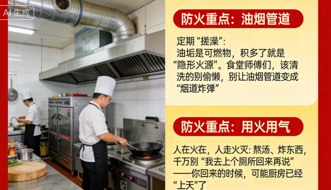 食堂的饭香是春天的治愈,但后厨的油烟管道、燃气设备也是防火的“重点盯防对象”。