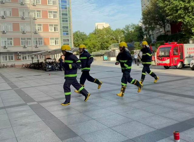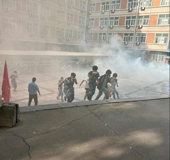 随着警报响起,宿舍楼内的学生迅速响应,在疏散组的引导下用湿毛巾捂住口鼻,弯腰低姿沿着墙壁快速疏散。 在引导学生疏散的同时,灭火行动组、安全救护组第一时间进入安全可控的火灾区域,灭火行动组进行快速灭火、安全救护组通过呼喊摸排的方式查看有无被困人员。六百余名学生在3分钟内有序集结到指定的安全广场,整个演练过程紧张而有序。